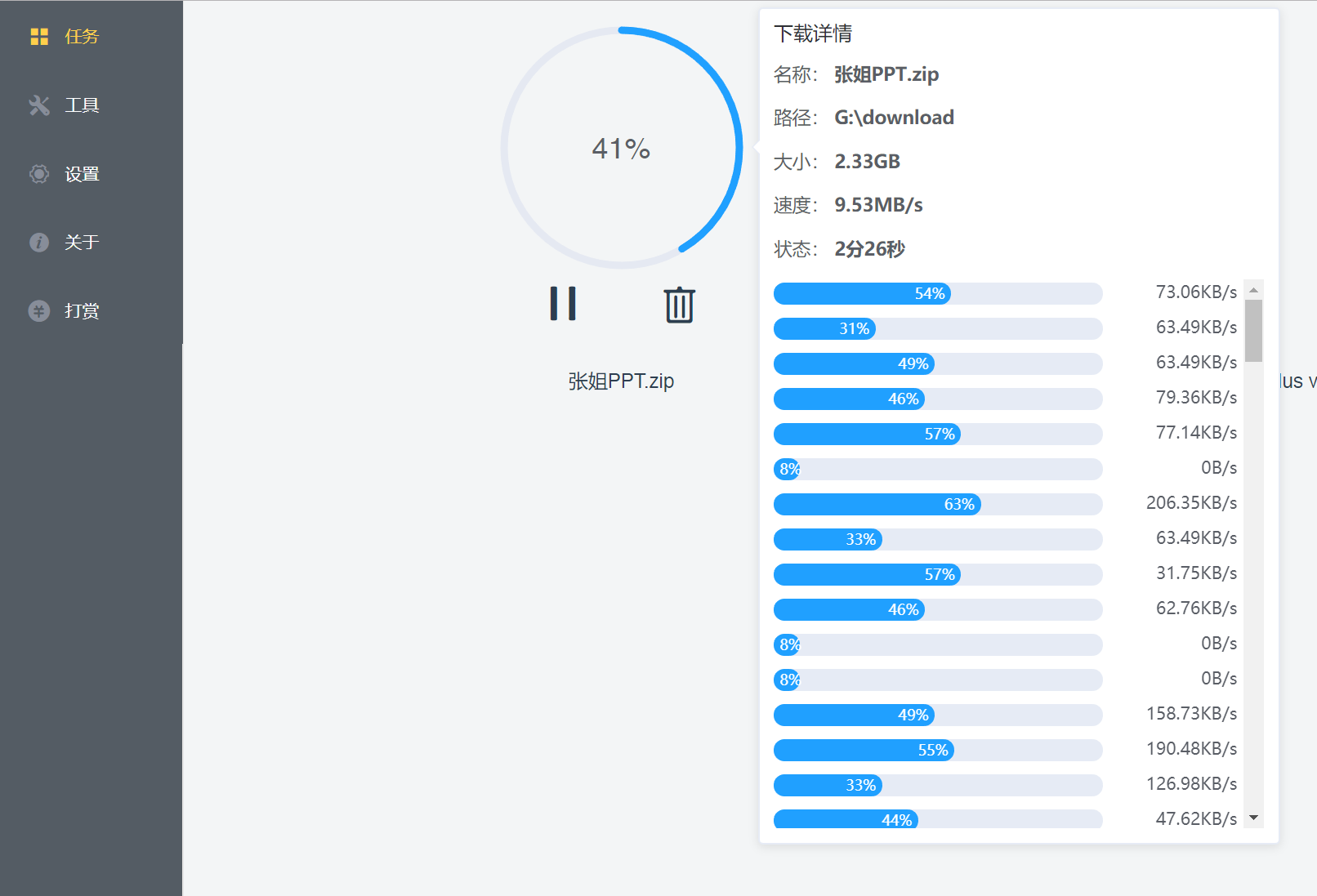 分段数:下载的线程数,最多128线程,线程越多不代表下载速度越快。